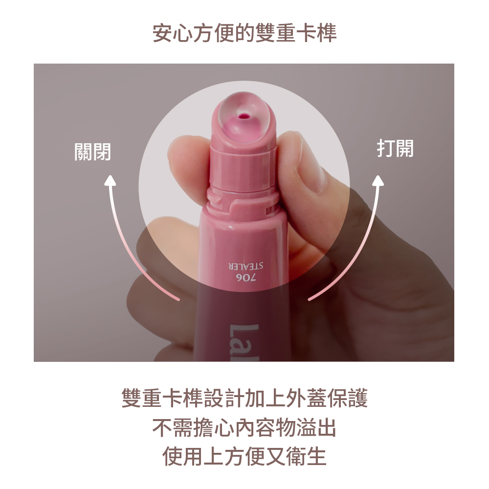 柔軟矽膠刷頭能貼合唇型,精準上色、不卡紋。卸除時可用面紙輕拭乾淨