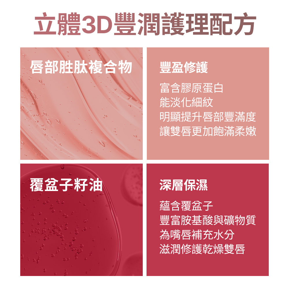 內含 Palmitoyl Tetrapeptide-1 與覆盆子籽油,有效提升唇部水潤與豐盈度,明顯改善唇部細紋