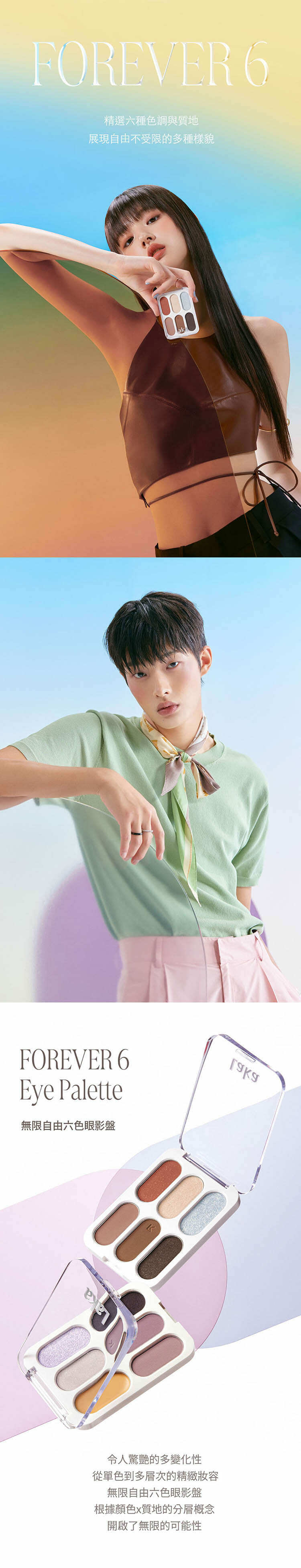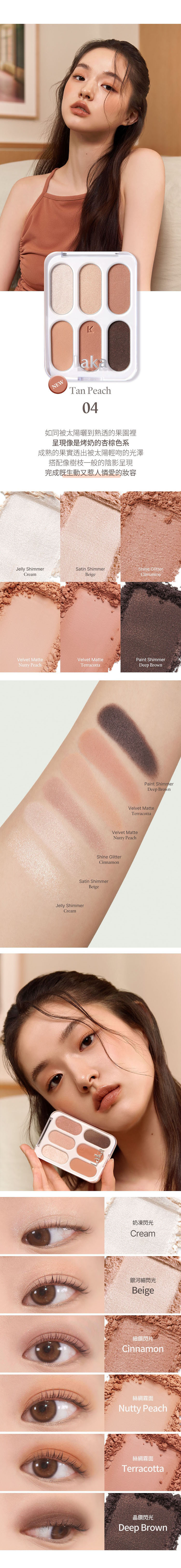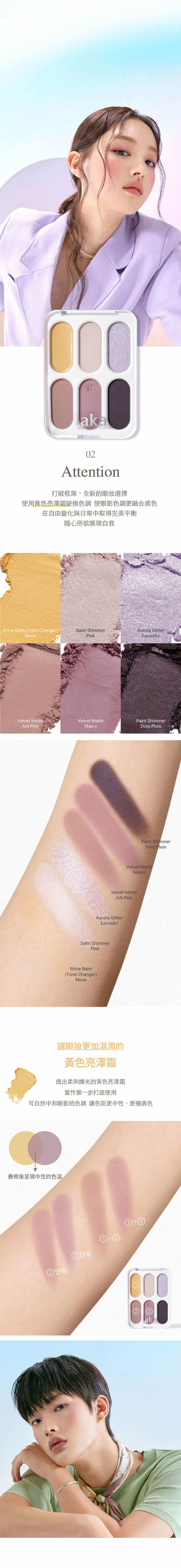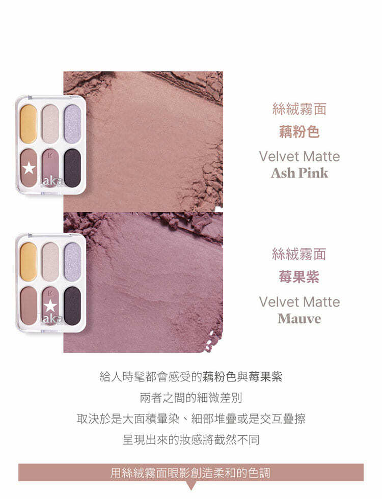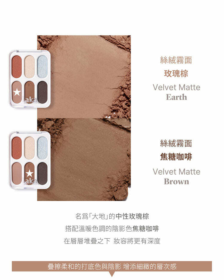- 精選六種色調與質地,透過分層堆疊的概念,開啟了眼妝的無限可能