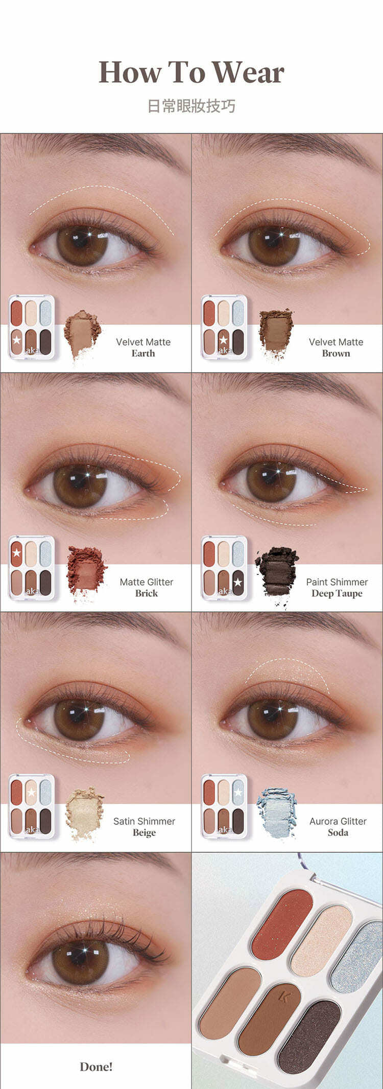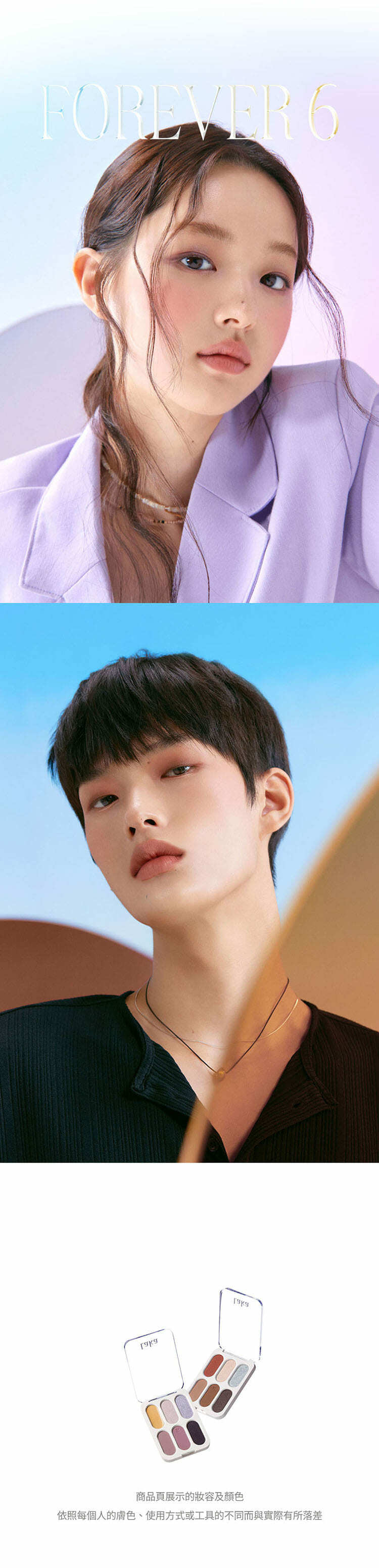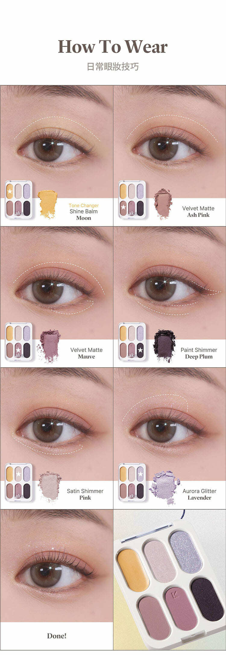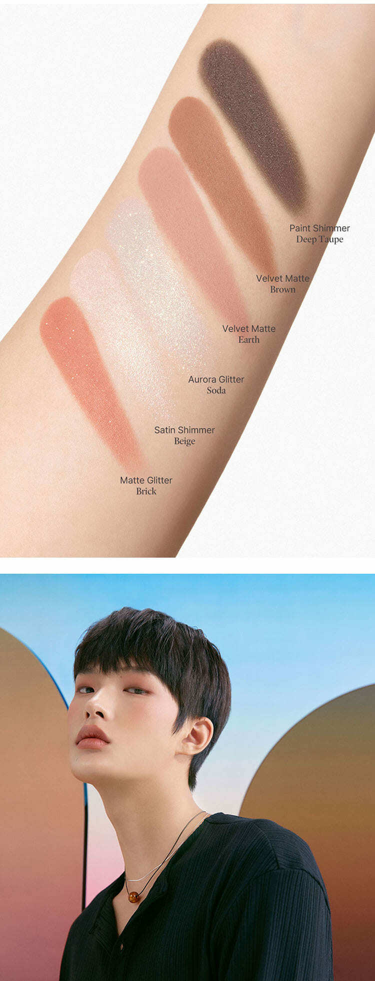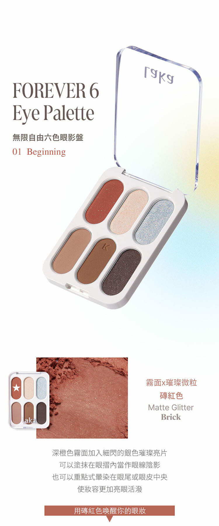 - 精選六種色調與質地,透過分層堆疊的概念,開啟了眼妝的無限可能
