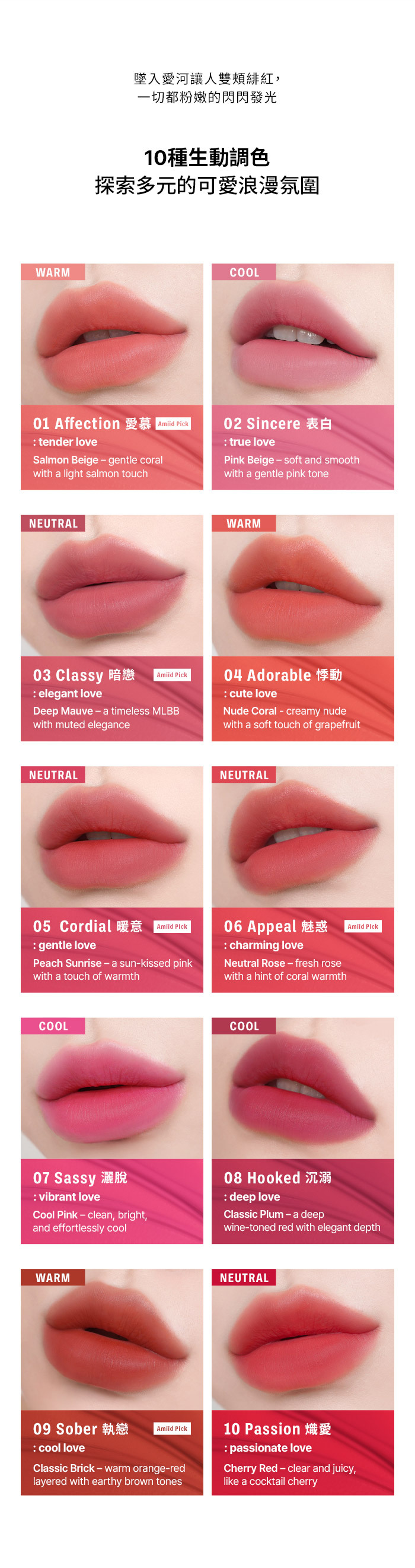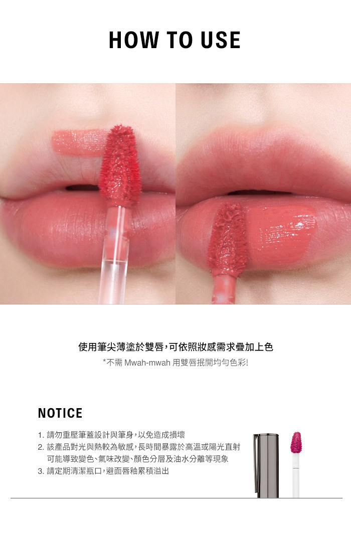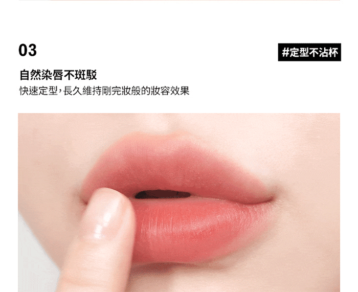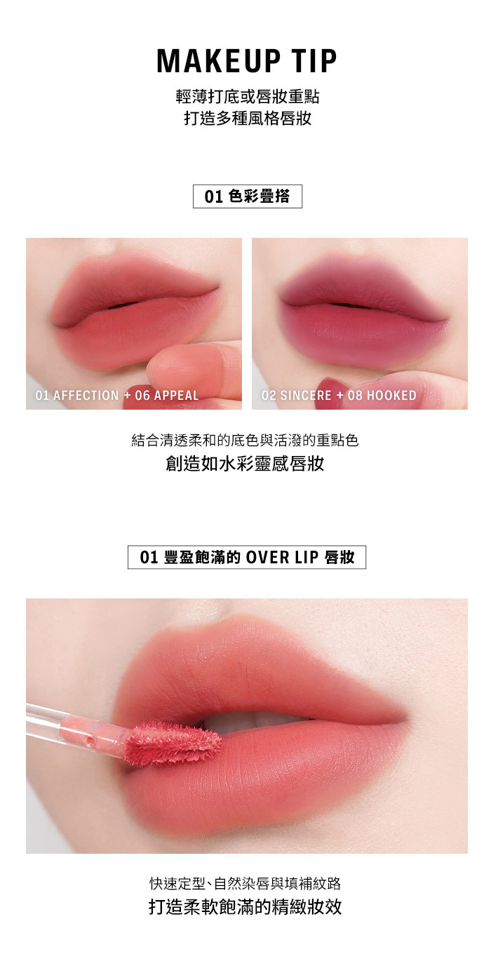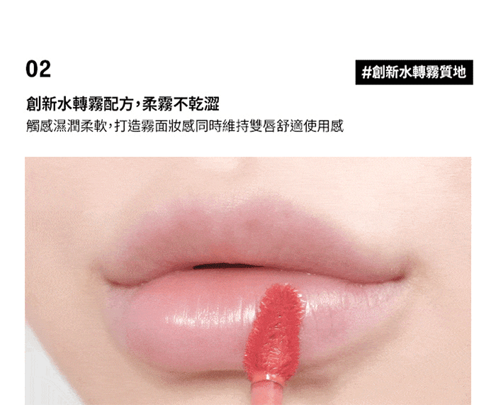 創新質地上唇後由水潤觸感轉為柔軟的霧面質感,質地輕盈不緊繃適合暈染、疊加變化,顏色快速定型自然滲透雙唇,全天候維持動人色澤